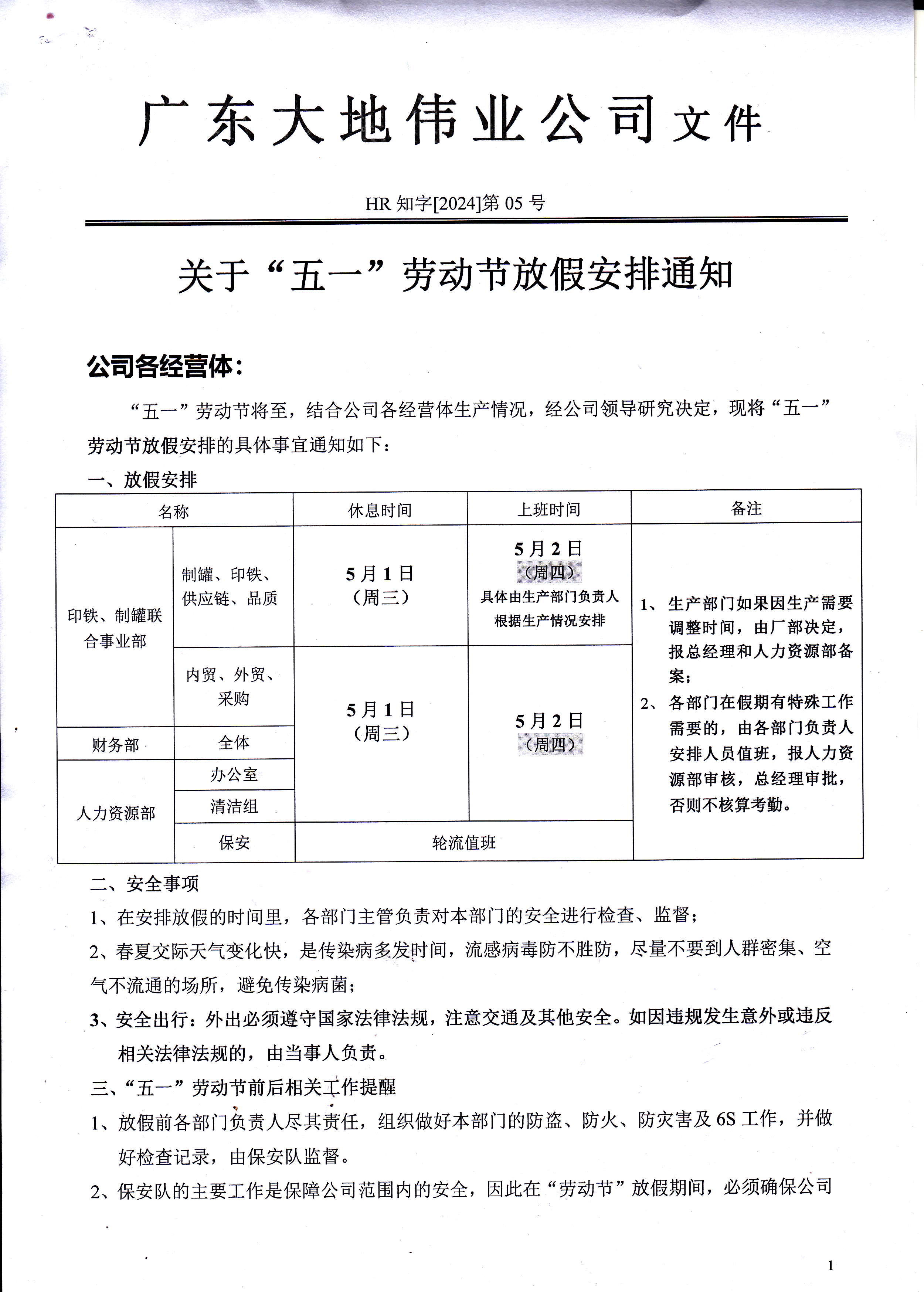 五一勞動(dòng)節(jié)放假時(shí)間為2024年5月1日(星期三)至2024年5月5日(星期日),共計(jì)5天。請(qǐng)各位員工提前做好工作安排,確保放假期間各項(xiàng)工作順利進(jìn)行。