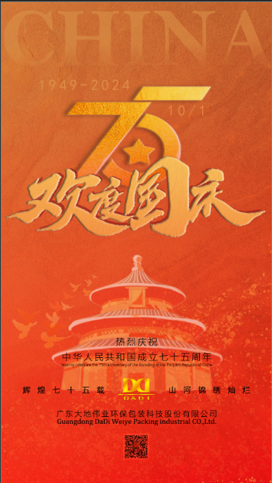國慶節(jié)是中華人民共和國成立的紀念日,也是全國人民共同歡慶、展現(xiàn)國家繁榮昌盛的重要時刻。廣東大地偉業(yè)環(huán)保包裝科技股份有限公司祝您和您的家人享受愉快的假期,感受國家的繁榮與強大,共同度過一個難忘而美好的節(jié)日!