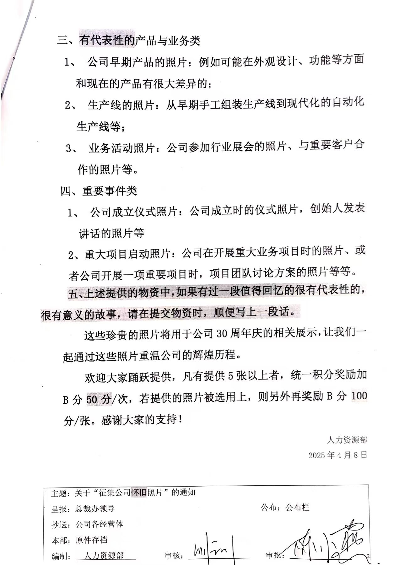 今年是我們公司成立30周年的大喜日子,為了更好地回顧公司發(fā)展歷程,展現(xiàn)公司成長歷程中的精彩瞬間,現(xiàn)面向全體員工征集公司懷|日照片或視頻。