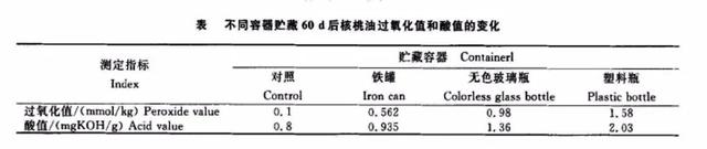 不同容器對核桃油氧化穩(wěn)定性的影響由表可知,貯藏60d后,不同包裝材料儲藏核桃油的過氧化值和酸值都呈上升趨勢,但其升高的速度有差異,鐵罐的貯藏效果最好,貯藏60d后其過氧化值由0.10mmol/kg升至0.562 mmol/kg,酸值由0.80mgKOH/g升至0.935mgKOH/g。無色玻璃瓶貯覆效果次于鐵罐,塑料瓶的貯藏效果最差。