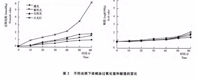 實驗二:光照試驗,核桃油裝人無色玻璃瓶,密封,分別在室溫避光、自然光、日光燈(10w)和紫外光(10w)條件下保存。